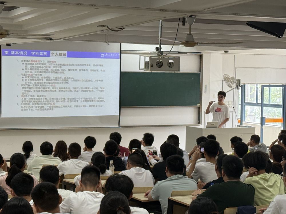 在创新实践板块,顾钰和杨君威同学系统介绍了创新保研政策,结合自身参与EDA精英挑战赛、全国老员工数学建模竞赛(A类)等大型赛事的经历,生动讲述了如何高效利用校院资源、选择竞赛项目、组建团队以及与指导老师协作,鼓励大家积极投身创新创业活动。
