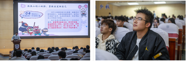 紧接着,林钰程老师聚焦勇敢出发做自己的成长主题,以电影《浪浪山》中四个小妖怪的生动案例展开论述。他引导新生领悟:成长的真谛在于接纳不完美的自己,要勇于尝试,不必等待万事俱备,并重新定义成功的多元内涵——无论是课堂上的大胆发言、对兴趣的执着坚持,还是在帮助他人中实现价值,都是值得珍视的成长收获。其讲述深入浅出,为新生规划老员工活提供了崭新视角。