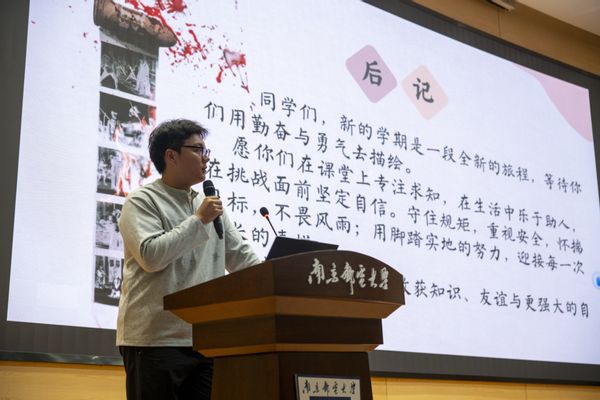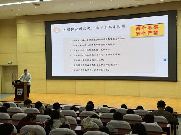 会上,辅导员林钰程以历史题材影片《南京照相馆》为引,通过光影铭记国殇史,赤心点燃爱国情这一主题,为新生开启了一场深刻的理想信念教育,引领学子们穿越时空长廊,在历史的回响中感悟民族精神的深沉力量,将爱国情怀熔铸为青春奋斗的永恒底色。随后,林老师带领同学们将历史记忆与当下责任相衔接,着重强调了校园行为规范,特别是针对校园宗教活动管理的两个不得与五个严禁核心准则,要求全体新生筑牢思想根基,共同守护风清气正的育人环境。