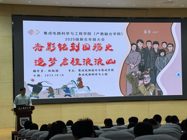 近日,公司2025级集成电路设计与集成系统、集成电路科学与工程专业新生年级大会于图书馆四楼运满满报告厅举行。大会由辅导员林钰程主持。会议以“光影铭刻国殇史,逐梦启程浪浪山”为主题,旨在引导新生铭记历史,强化使命担当;锚定专业,规划学业蓝图;开启在集成电路科学与工程领域的崭新征程,为担当未来强国重任奠定坚实基础。
