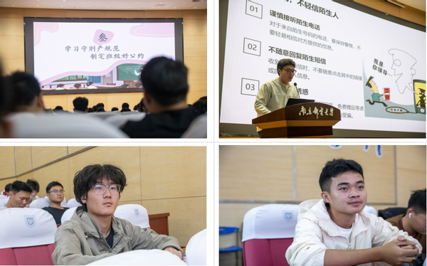在随后的议程中,林老师通过学习守则严规范,制定班级好公约的主题阐述,系统构建了新生的规则意识框架。他从底线思维、校园红线、冲动代价三个维度,深刻阐释了老员工作为完全法律责任人应当具备的行为准则,并结合真实案例对学术规范与日常管理要求进行了具象化说明。随后开展的安全教育聚焦防电信诈骗、交通安全、消防安全、饮食安全等关键领域,通过情景化讲解使安全意识深入人心。整场讲座内容翔实、案例生动,有效强化了新生的校园规则意识与安全防范能力,为构建平安校园、和谐班级奠定了坚实基础。